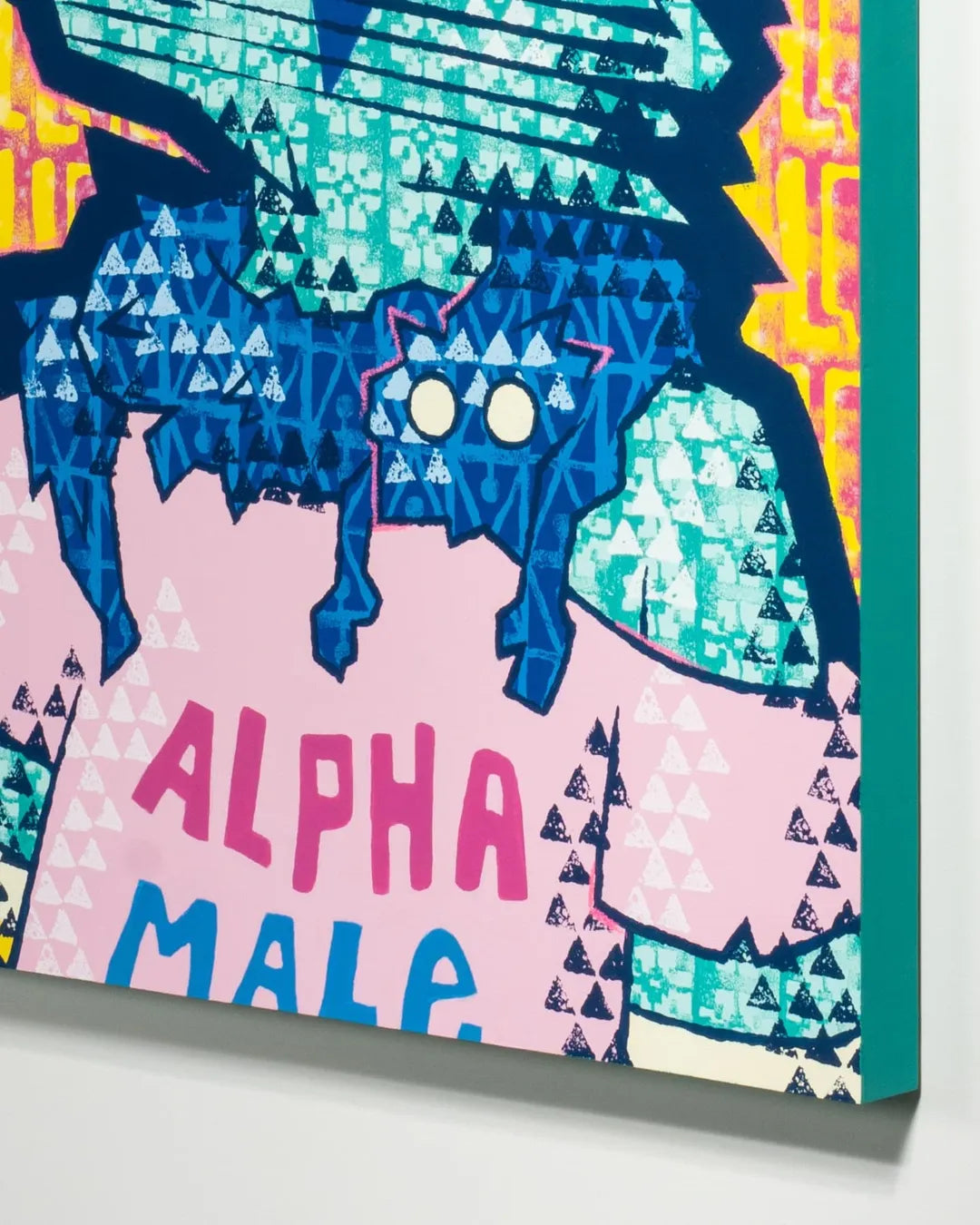 This vibrant canvas brings playful energy and sharp commentary together in one striking piece. Featuring a stylized turquoise bear wearing a party hat and a pink shirt emblazoned with the words “Alpha Male,” the artwork blends humor, bold patterns, and street-art influence. Bright yellows, hot pinks, and layered textures make it stand out as both a fun and thought-provoking statement piece. Perfect for modern spaces, creative studios, or anyone who appreciates pop art with an edge, this canvas adds character and color to any wall. Printed on high-quality canvas for long-lasting vibrancy.