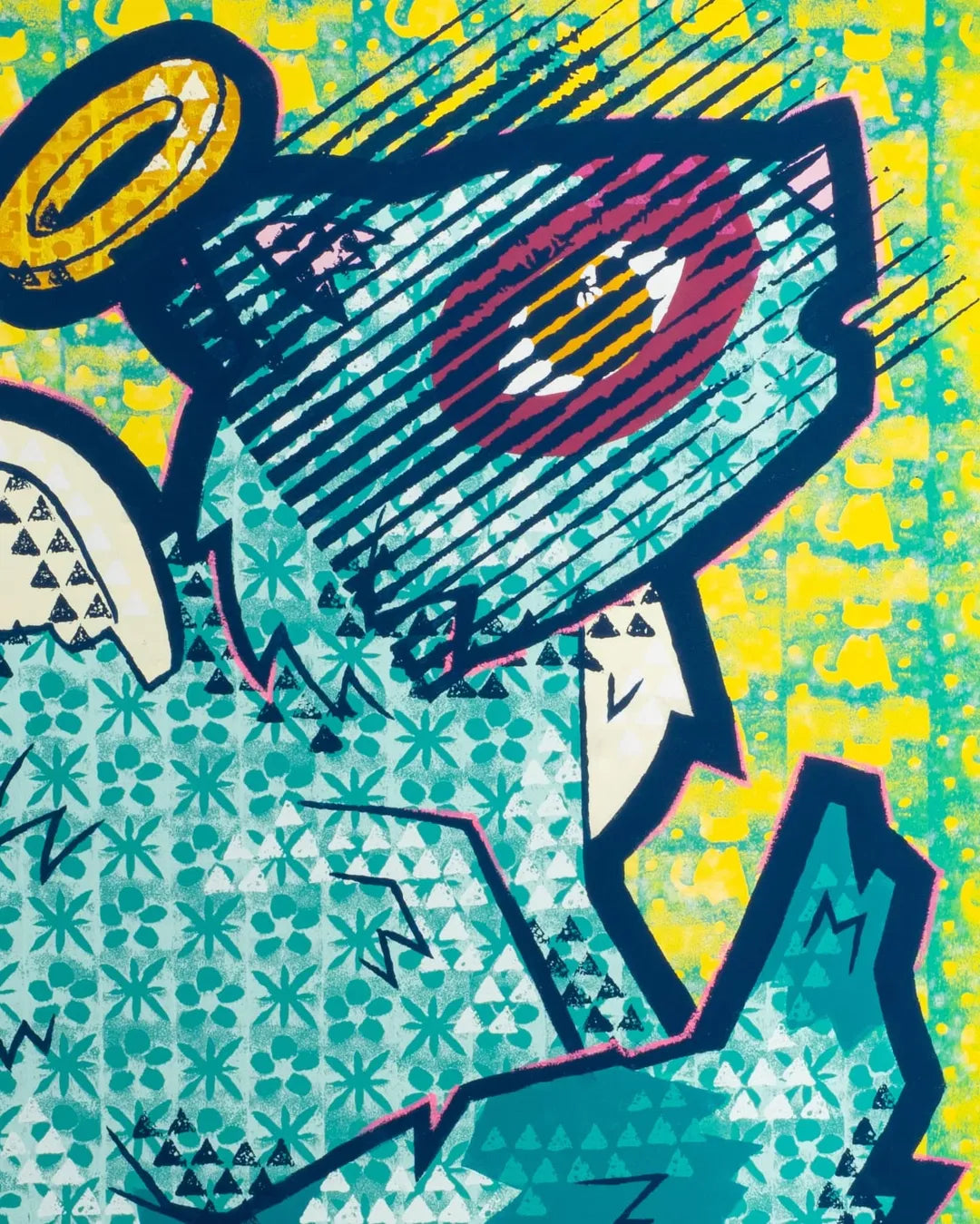 This playful pop art canvas features a turquoise bear with angel wings and a golden halo, blending innocence with bold street-art edge. Layered with geometric floral patterns and vivid shades of teal, yellow, and magenta, the piece radiates both humor and charm. The expressive design makes it perfect for adding a touch of personality to modern interiors, creative studios, or eclectic collections. Printed on premium-quality canvas, it’s a vibrant and unique statement piece that sparks curiosity and conversation.