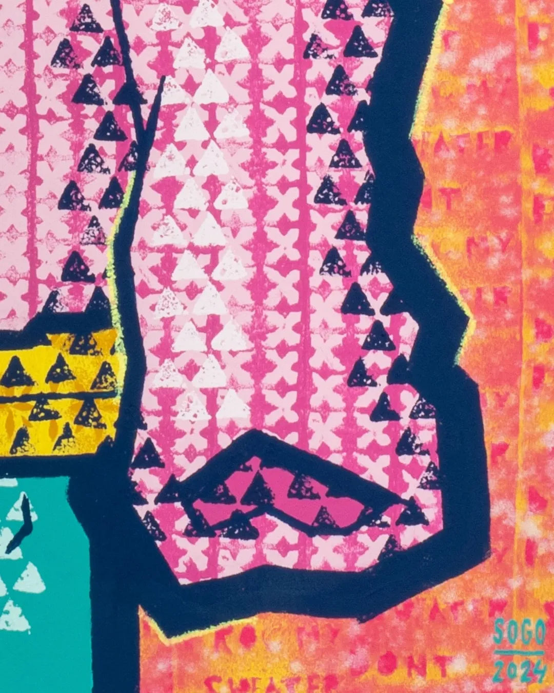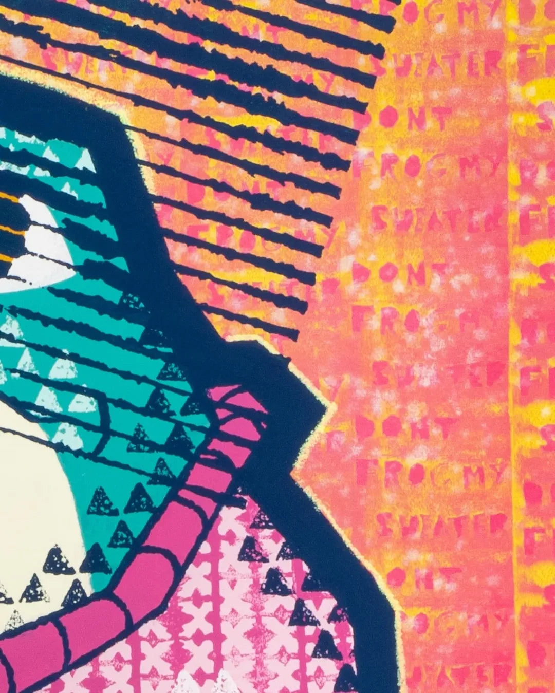 This quirky and colorful pop art canvas showcases a turquoise frog character wearing a bright pink patterned sweater with a frog motif, set against a fiery orange and yellow backdrop. With its bold outlines, layered textures, and playful humor, the artwork perfectly balances street-art energy with lighthearted charm. Ideal for modern homes, creative studios, or eclectic collections, this piece makes a fun statement that sparks conversation. Printed on premium canvas for long-lasting vibrancy, it’s the perfect artwork for anyone who loves bold colors and unique character design.