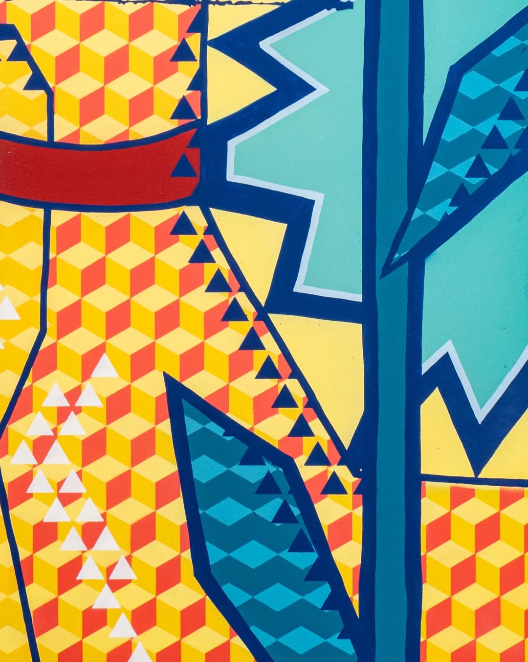 This colorful rabbit canvas print combines bold geometric patterns with a playful pop-art feel. The rabbit, designed in warm yellows and oranges with repeating cube motifs, stands tall between two vibrant red flowers on a turquoise background. The piece mixes modern street-art influence with cheerful color, making it a standout for any space. Perfect for those who love unique, energetic artwork that sparks conversation.