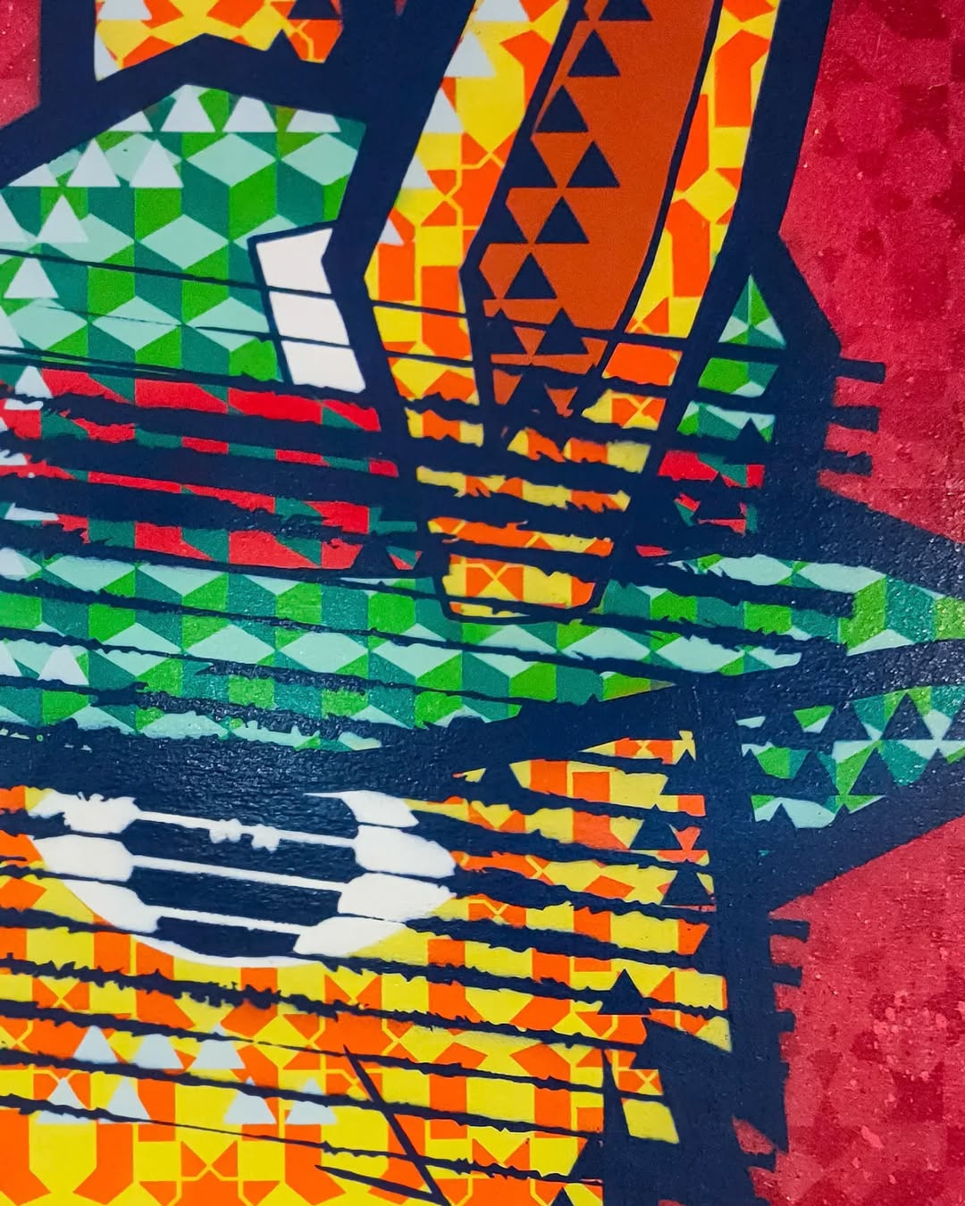 Step into a world of bold imagination with this rabbit-in-a-suit canvas artwork. Featuring vivid geometric patterns in green, orange, yellow, and pink, the piece captures the playful sophistication of a rabbit character dressed in a jacket, shirt, and tie. The deep red background intensifies the pop-art aesthetic, while the layered textures and street-inspired details make this painting stand out as a conversation starter. Perfect for collectors and modern interiors looking for something unique.
